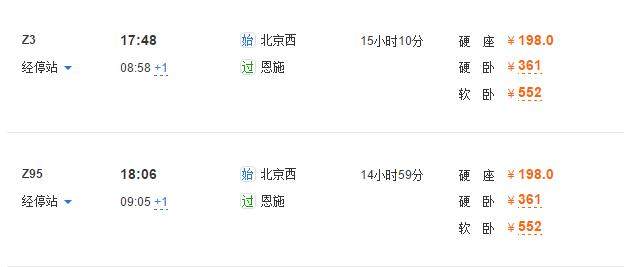 【去程车票】 6月15号晚上的车票,北京西→恩施 各地火车/飞机出发→恩施 北京西→恩施的Z3次 或者 Z95次列车均可。