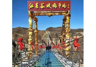 红崖谷景区位于河北省石家庄市平山县境内,红崖谷玻璃吊桥位于红崖谷海拔最高处,全长488米,有433个玻璃台阶,桥面到坳底垂直距离218米,桥面自然下坠形成一个倒彩虹型,是目前世界上最长的玻璃桥。玻璃吊桥四周有青山环绕,下有红崖坳苍茫郁秀、风光秀丽、景色绝美。行走其上仿佛御风而行,上下越颠簸,左右摇摆,刺激无比!