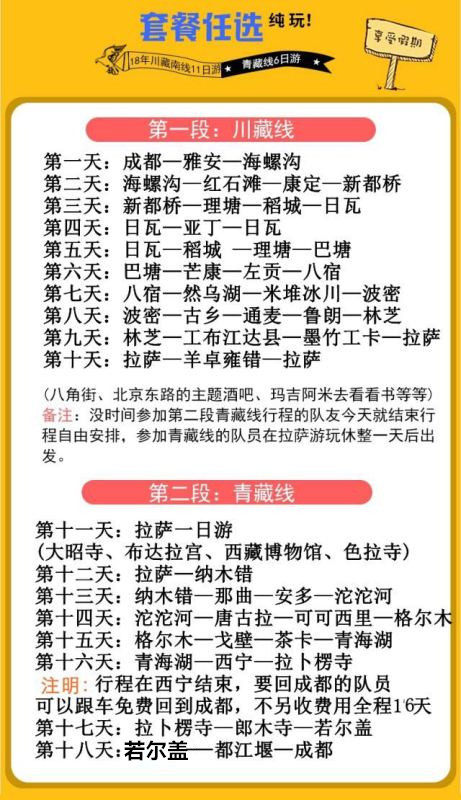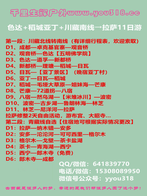 【出发日期】:散客拼车每周三、六铁定出发!团体包车随时出行! 【活动规则】: 本活动采取拼车自助游的形式,面向全国召集同伴,成都集合出发。两段一共18天,可以根据自己的时间分段参加,全程不赶路,随时停车拍照玩耍,食宿实行AA制,丰俭自己掌握。主张不穷游,不腐败,不自虐。队员中推选财务,所有消费公开透明,没有任何购物和强制消费环节,最大限度满足各位队员的合理要求! 【报名须知】: 本线路跨越四川、云南、西藏、青海、甘肃5省,沿途景点分散,景色非常优美,请尊重当地民风民俗,经过藏区时听从领队指导。希望您身体健康,性格开朗,有一定的团结协作能力! 更多详情咨询QQ/微信:641839770 电话/微信:15308089950 微信公众号:yyou318