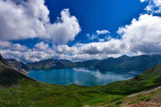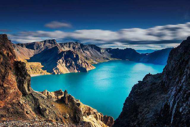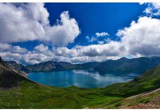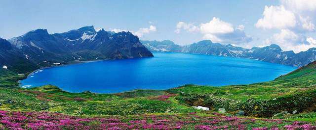 长白山天池(Changbai mountain pool in the sky)是一座休眠火山,火山口积水成湖,夏融池水比天还要蓝;冬冻冰面雪一样的白,被16座山峰环绕,仅在天豁峰和龙门峰间有一狭道池水溢出,飞泻成长白瀑布,是松花江的正源。
