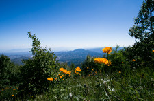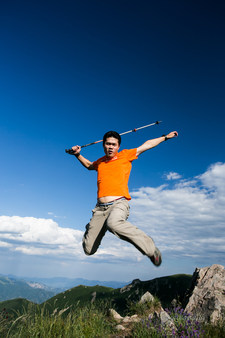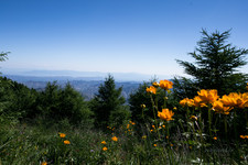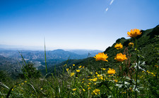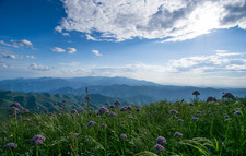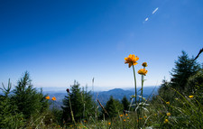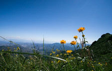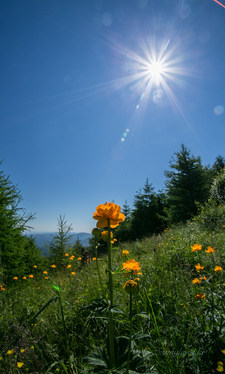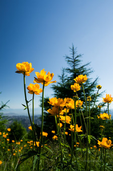 碧蓝的天、五彩的太阳及其万丈的光芒、翠绿的松树和高挺的花径、黄色的花朵在光照下几...