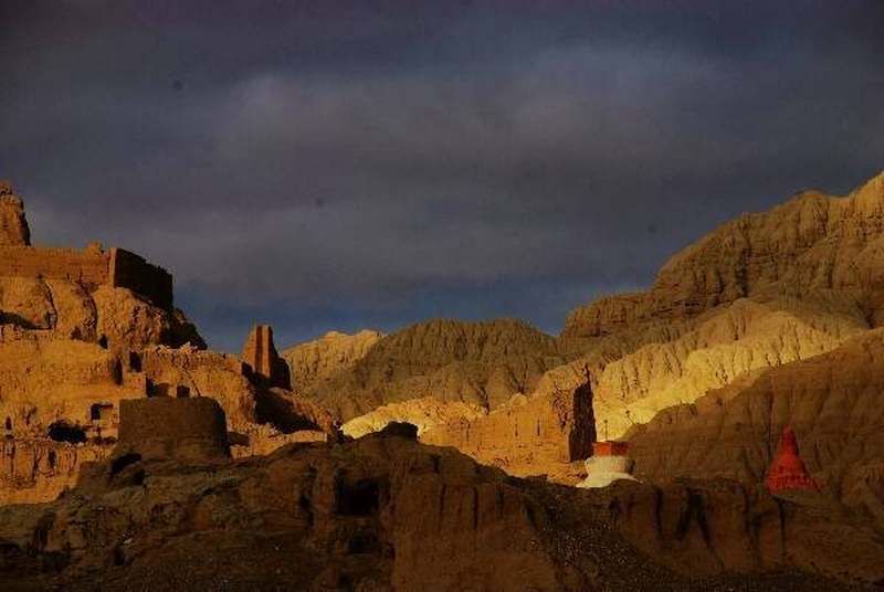 古格王朝遗址位于这片土林的边缘,象泉河谷的南侧。日落时分,寂寥的村落与大地共融一色,仿佛昭示着世界亘古如斯般平静。然而,在距今大约1100年前,同样的金色余晖中,伫立着的却是强盛一时的古格王国的辉煌宫殿和宏伟寺院。从现存的残颓遗址可以想见,当时气象之盛,场面之巨,远非眼前这般光景可比。札不让,从一个巍峨的都城到寂寂无名的小村地名的嬗变,多少令人在感叹天地造化土林之功以后,又叹世事沧桑之巨变。 在距今约1100年前,同样的余晖中,伫立着的却是强盛一时的象雄王国和古格王国的宫殿和寺院。 从现存的残颓遗址可以想象得到当时场面的巨大,远非眼前这般光景可比。在海拔4000米以上的雪域高原,古格曾经创造了奇迹,而如今这一切都消逝了,只留下了一些斑驳的遗迹和大片的黄土。古格王朝在西藏历史上具有重要意义,它是吐蕃王室后裔在吐蕃西部阿里地方建立的地方政权,其统治范围最盛时遍及阿里全境。它不仅是吐蕃世系的延续,而且使佛教在吐蕃瓦解后重新找到立足点,并由此逐渐达到全盛。古格雕塑多为金银佛教造像,其中成就最高的是被称为古格银眼的雕像。