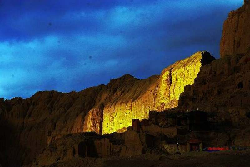 古格王朝遗址位于这片土林的边缘,象泉河谷的南侧。日落时分,寂寥的村落与大地共融一色,仿佛昭示着世界亘古如斯般平静。然而,在距今大约1100年前,同样的金色余晖中,伫立着的却是强盛一时的古格王国的辉煌宫殿和宏伟寺院。从现存的残颓遗址可以想见,当时气象之盛,场面之巨,远非眼前这般光景可比。札不让,从一个巍峨的都城到寂寂无名的小村地名的嬗变,多少令人在感叹天地造化土林之功以后,又叹世事沧桑之巨变。 在距今约1100年前,同样的余晖中,伫立着的却是强盛一时的象雄王国和古格王国的宫殿和寺院。 从现存的残颓遗址可以想象得到当时场面的巨大,远非眼前这般光景可比。在海拔4000米以上的雪域高原,古格曾经创造了奇迹,而如今这一切都消逝了,只留下了一些斑驳的遗迹和大片的黄土。古格王朝在西藏历史上具有重要意义,它是吐蕃王室后裔在吐蕃西部阿里地方建立的地方政权,其统治范围最盛时遍及阿里全境。它不仅是吐蕃世系的延续,而且使佛教在吐蕃瓦解后重新找到立足点,并由此逐渐达到全盛。古格雕塑多为金银佛教造像,其中成就最高的是被称为古格银眼的雕像。